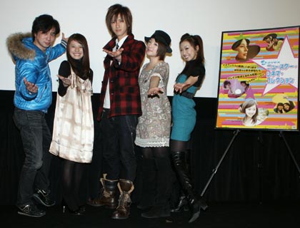 映画のポスターと並んでポーズを決める三城真一監督、近野成美さん、相葉弘樹さん、高山都さん、武下公美さん(左から)。ちなみにポーズは三城監督発案ですが映画の内容とはまったく関係ありません