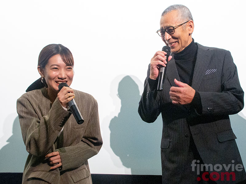 親子を演じた菅田俊さん(右)と矢野優花さん。撮影中のふたりのエピソードを聞かれると菅田さんは「ないよねえ」と矢野さんの笑いあい、客席の笑いを誘いました