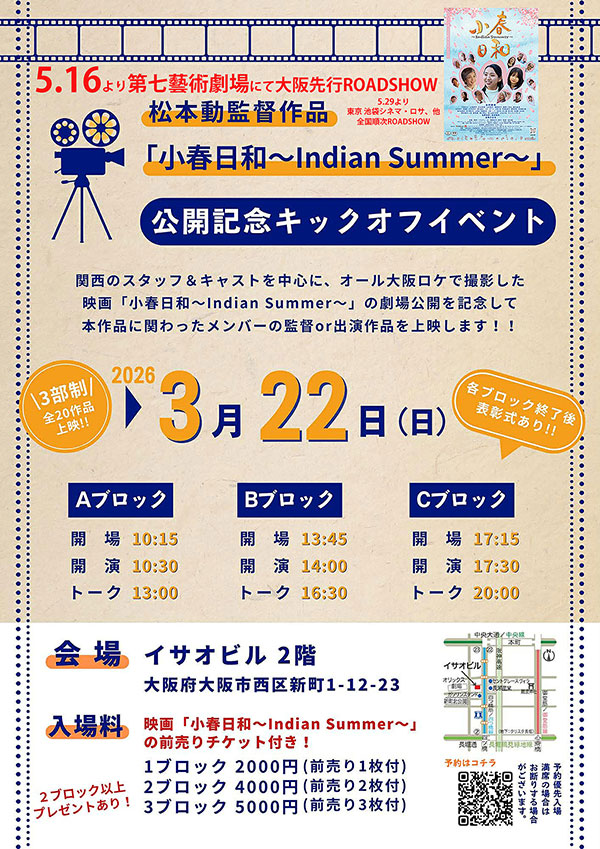 楠部知子さんが企画・プロデュースし水村美咲さんが主演、松本動監督がメガホンをとった『小春日和~Indian Summer~』が5月に大阪先行公開・全国順次公開されるのに向け、松本監督の過去作や楠部さん、水村さんの出演作など『小春日和~Indian Summer~』に携わったスタッフ・キャストの関連作品20作を上映する公開記念キックオフイベントが3月22日に大阪で開催されます。