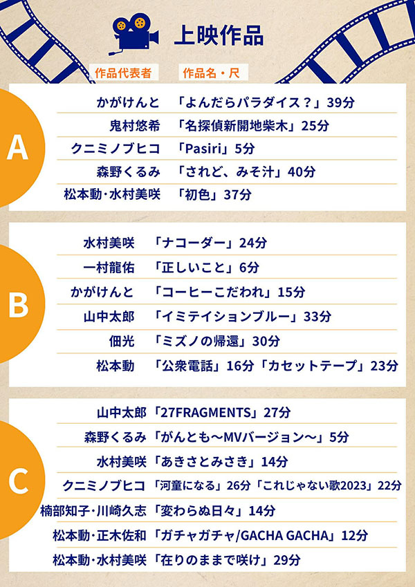 水村さんや楠部さんの出演作に加え出演俳優陣の出演作・監督作、演出部・制作部として参加した佃光監督、鬼村悠希監督、山中太郎監督の監督作など、『小春日和』の関連作であると同時に関西インディーズ映画シーンの空気にも触れられる作品群が揃いました。